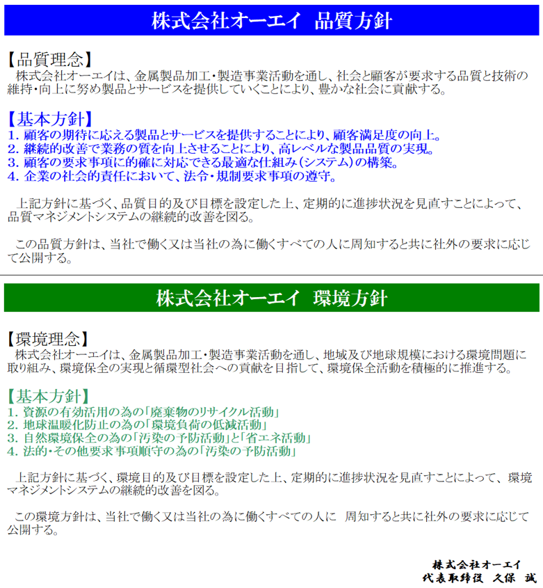 品質マネジメントシステムの継続的改善を図り、お客様との信頼関係を築き、また環境マネジメントシステムにより環境負荷低減活動を積極的に推し進める事で、安全安心かつ安定した会社経営を推進しています。